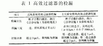 表 1 中, 主實(shí)驗室排風(fēng)高效過(guò)濾檢漏, 其檢漏方法“: 粒子計數掃描法, 執行《 潔凈室施工及驗收規范》JGJ71” ( 以下簡(jiǎn)稱(chēng)《 規范》JGJ71) 。在該規范附錄六“: 3.粒子計數器法檢漏…( 4) 檢漏時(shí)將采樣口放在距離被檢過(guò)濾器表面 2~3 cm 處, 以 5~20 mm/s 的速度移動(dòng), 對被檢過(guò)濾器整個(gè)斷面, 封頭膠和安裝框架處進(jìn)行掃描[3]?!倍?nbsp;規范》中 5.3.4 條中要求“ : 第一道排風(fēng)高效過(guò)濾器的位置不得深入管道或夾墻內部, 應緊鄰排風(fēng)口。過(guò)濾器位置與排風(fēng)口結構應易于對過(guò)濾器進(jìn)行安全更換[2]”。筆者認為, 用《 規范》JGJ71 規定的粒子計數器掃描法很難對排風(fēng)高效過(guò)濾器進(jìn)行檢漏。因為排風(fēng)高效過(guò)濾器是通過(guò)靜壓箱與排風(fēng)管道、閥門(mén)及排風(fēng)機等設備及部件連成一體的, 要求用上述方法對排